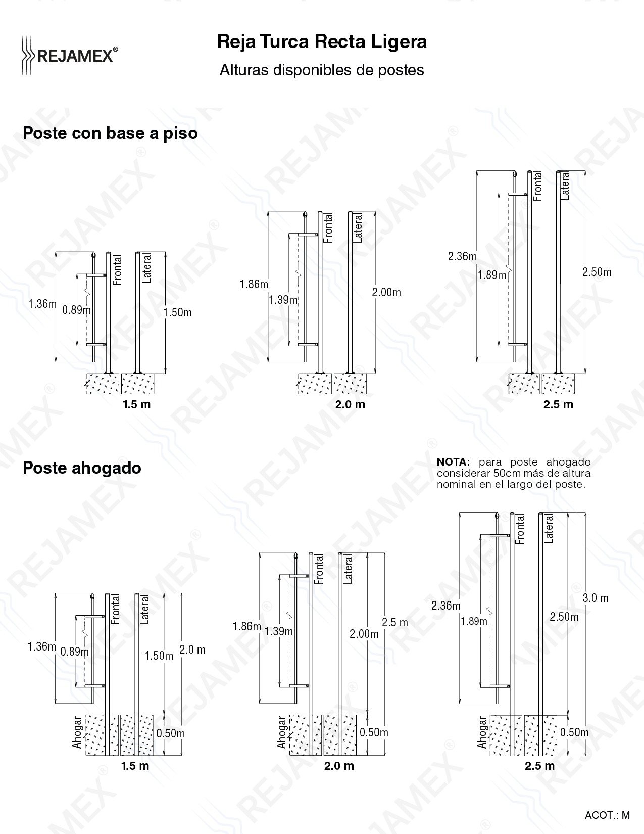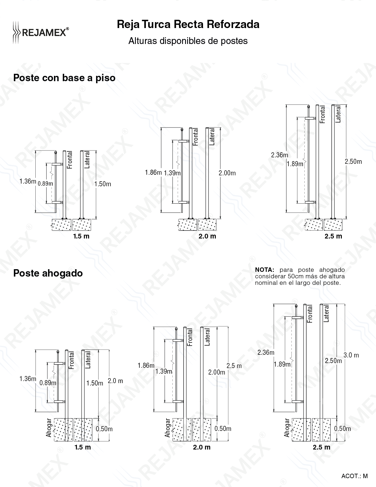 Nuestros sistemas de rejas pueden ser instalados de 2 formas y dependerán del tipo de suelo, si es tierra, los postes deberán ahogarse 50 cm., si el suelo es de concreto, los postes deberán llevar una base con taquetes.